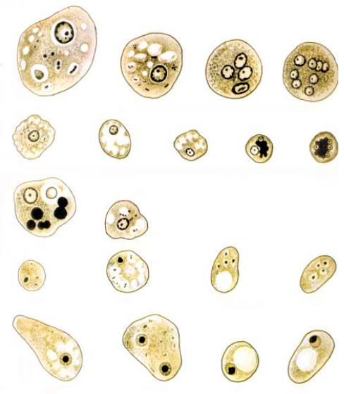а — Entamoeba coli (1, 2 — вегетативные формы; 3 — четырехъядерная циста; 4 — восьмиядерная циста); б — Entamoeba hartmanni (1–3 — вегетативные формы; 4 — двухъядерная циста; 5 — четырехъядерная циста); в — Entamoeba gingivalis (1–2 — вегетативные формы); г — Endolіmax nаnа (1–2 — вегетативные формы; 3–4 — цисты); д — Іodamoeba butschlii (1–2 — вегетативные формы; 3–4 — цисты); окраска железным гематоксилином по Гейденгайну