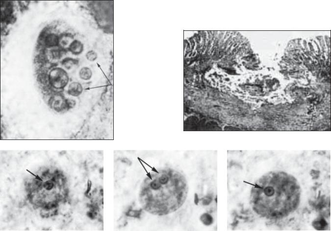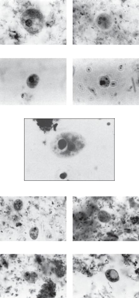 Циста (рис. 7.5, б) размером 6– 10 мкм, овальной или округлой формы. Оболочка хорошо выражена, в цитоплазме часто обнаруживается гликогеновая вакуоль, число ядер обычно 2–4.