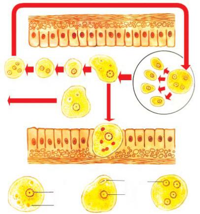 грязных рук. Механическими переносчиками могут быть мухи и тараканы. В кишечнике оболочка цисты растворяется, ядра делятся пополам, из каждой цисты образуется 8 просветных форм (forma minuta), являющихсясапрофитами.