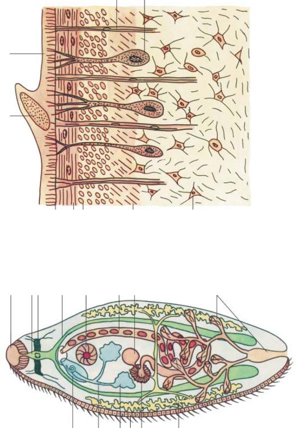 Телопокрытокожно-мускульныммешком. Кутикула, выделяемая эпителием, частоимеет шипы. Мышечные волокна расположены в три слоя: наружный — кольцевой, средний— диагональный, внутренний — продольный. Вбоковыхобластях расположены дорсовентральные волокна. Между органами размещается губчатая паренхима, выполняющая опорную и трофическую функции (рис. 13.1, б).