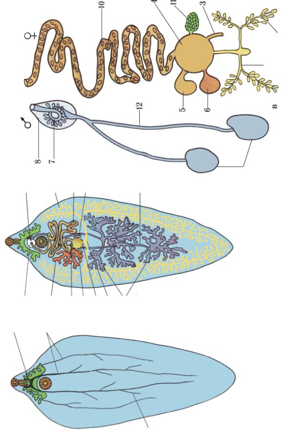 Рис. 13.3. Системы органов трематод на примере печеночного сосальщика (Fasciola hepatica): а — нервная система (1 — окологлоточное кольцо; 2 — нервные стволы (брюшные; боковые); 3 — перемычки (комиссуры)); б — гермафродитная половая система; в — схема гермафродитной половой системы трематод (1 — семенники; 2 — желточные протоки; 3 — Лауреров канал; 4 — оотип; 5 — семяприемник; 6 — яичник; 7 — циррусная сумка; 8 — циррус; 9 — желточник, 10 — матка (влагалище), 11 — тельце Мелиса, 12 — семяпровод)