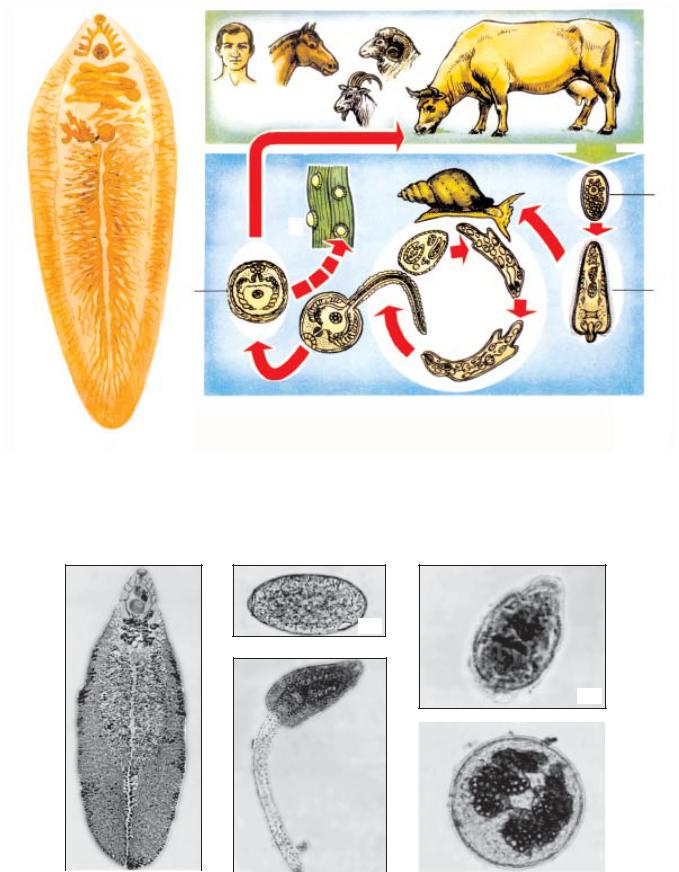 Рис. 14.1. Внешний вид и жизненный цикл печеночного сосальщика (Fasciola hepatica):