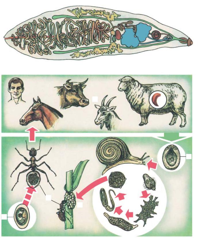 Рис. 15.1. Внешний вид и жизненный цикл ланцетовидного сосальщика (Dicrocoelium lanceatum):