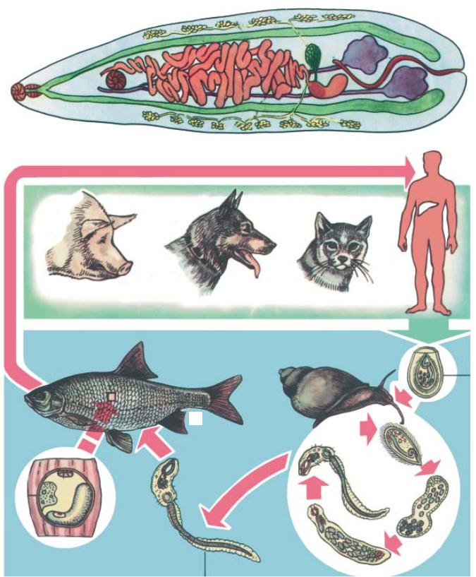 Рис. 16.1. Внешний вид и жизненный цикл кошачьего сосальщика (Opisthorchis felineus):