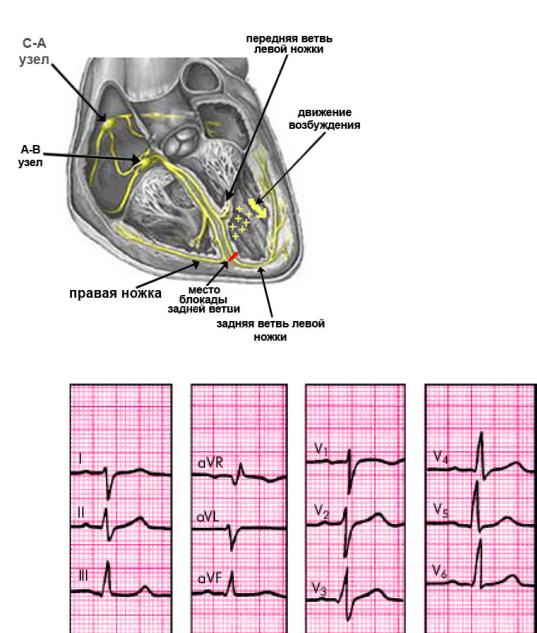При полной блокаде передней ветви левой ножки пучка Гиса возбуждение обычным путём распространяется по задним и нижним отделам левого желудочка, а затем по анастомозам между ветвями проникает в проводящую систему передней