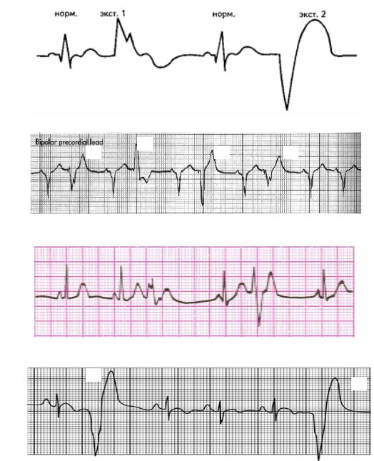 Рис. 3.15. А – полиморфные и полифокусные экстрасистолы (форма и интервалы сцепления различны); Б и В – полиморфные и монофокусные экстрасистолы (форма различна, интервалы сцепления одинаковы); Г – мономорфные и монофокусные экстрасистолы (форма и интервалы сцепления одинаковые)