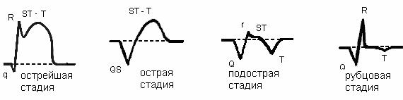 Острая стадия длится две-три недели. При Q-инфаркте в её начале регистрируется комплекс QS, ещё более приподнятый сегмент ST и слившийся с ним в одну куполообразную кривую высокий положительный зубец Т. Во время этой стадии сегмент ST постепенно приближается к изолинии, а зубец Т становится отрицательным. Острая стадия считается закончившейся, когда при динамическом наблюдении за изменениями ЭКГ сегмент ST перестанет смещаться вниз и стабилизируется в положении на изолинии или очень близко около неё. Если же в острую стадию не происходит смещения сегмента ST к изолинии («застывший ST»), это считается одним из признаков образования острой аневризмы сердца. В этом случае диагноз аневризмы подтверждается в 80% случаев.