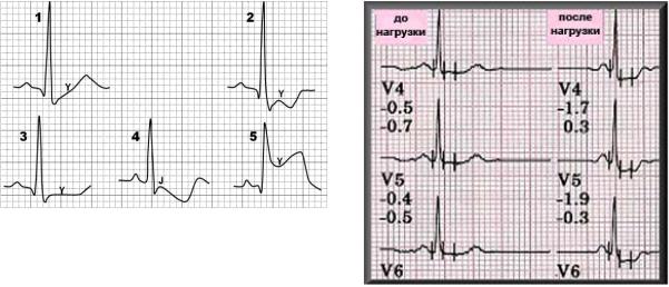 Первые регистрируются при следующих трёх состояниях – инфаркте миокарда, блокаде ножек пучка Гиса и гипертрофии желудочков. При инфаркте миокарда и при полных блокадах ножек пучка Гиса изменение сегмента ST является обязательным ЭКГ-симптомом такого диагноза. Отсутствие смещения сегмента ST вниз и отрицательного зубца Т в отведении V1 при полной блокаде правой ножки пучка Гиса и в отведениях V5 и V6 при полной блокаде левой ножки пучка Гиса заставляет предположить другие изменения миокарда при этих блокадах. Изменения сегмента ST и зубца Т обязательно наступает при достижении гипертрофией определённой величины.