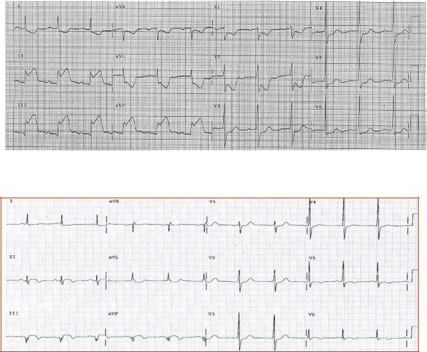 Рис. 5.8. А – острейшая (часы) стадия острого инфаркта миокарда нижней стенки ЛЖ (подъем ST II, III, aVF) с реципрокной депрессией ST в V1-V3: