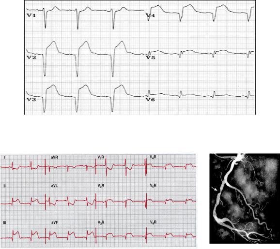 Рис. 5.10. Острый инфаркт миокарда нижней стенки ЛЖ с вовлечением правых отделов (см. правые грудные отведения) при критическом стенозе правой коронарной артерии