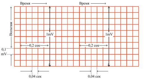 Рис 1.17. Сетка для оценки амплитудных и временных параметров ЭКГ (скорость движения ленты ЭКГ 25 мм/с)