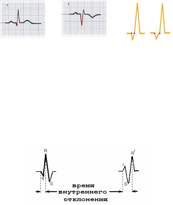 Интервал времени от начала желудочкового комплекса до вершины зубца R (если их в комплексе несколько, то до вершины последнего) называется «внутреннем отклонением» (рис. 1.20). В отведении V1 его величина не более 0,03 с, а в отведении V6 – не более 0,05 с.
