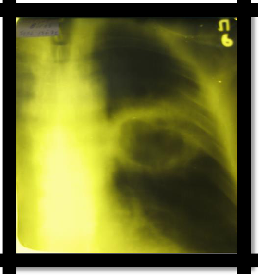 X-ray (linear tomography, CT) signs of a cavity syndrome in the lung are limited enlightenment of a round or oval shape, usually against a background of blackout. A horizontal level of fluid in the cavity is characteristic if it communicates with the bronchus and contains exudate and air.