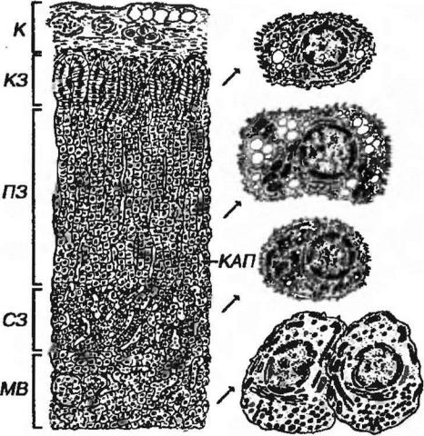Рис. 3-12. Надпочечник: вид на гистологическом препарате и ультраструктура клеток различных отделов. К - капсула, КЗ - клубочковая зона, ПЗ - пучковая зона, СЗ - сетчатая зона, МВ - мозговое вещество, КАП - капилляры.