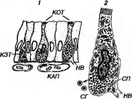Рис. 3.13. Клетки диффузной эндокринной системы. 1 - клетки открытого (КОТ) и закрытого (КЗТ) типов в слизистой оболочка. 2 - ультраструктура клетки ДЭС. КАП - капилляр. НВ - нервное волокно. СП - синаптические пузырьки, СГ - секреторные гранулы.