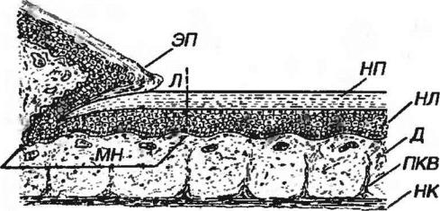 Рис. 4-6 Ноготь. НП - ногтевая пластинка, Л - луночка, НЛ - ногтевое ложе, МН - матрица ногтя, Д - дерма, ПКВ - пучки коллагеновых волокон, НК - надкостница, ЭП – эпонихий