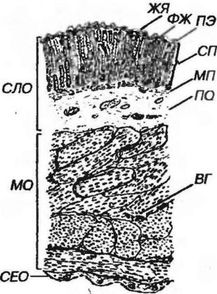 Рис. 5-7 Стенка желудка (продольный срез). СЛО - слизистая оболочка: ЖЯ - желудочные ямки, ПЭ - покровный эпителий, СП - собственная пластинка, ФЖ - фундальные железы, МП - мышечная пластинка, ПО - подслизистая основа, МО - мышечная оболочка, ВГ - вегетативный ганглий (межмышечного сплетения), CEO - серозная оболочка.