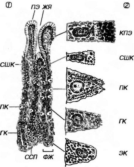 Рис. 5-8. Участок слизистой оболочки желудка с фундальными железами (1) и ультраструктура клеток желудочной ямки и фундальной железы (2). ЖЯ - желудочная ямка, ПЭ - покровный эпителий, ССП - соединительная ткань собственной пластинки, ФЖ - фундальная железа, ГК - главная клетка, ПК - париетальная клетка, СШК - слизистая шеечная клетка, КПЭ - клетка покровного эпителия, ЭК - эндокринная клетка.