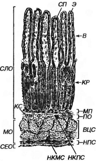 Рис. 5-9. Тонкая кишка (продольный срез). СЛО - слизистая оболочка: Э - эпителий, СП - собственная пластинка, В - ворсинки, КР - крипты, МП - мышечная пластинка, ПО - подслизистая основа, КС - кровеносные сосуды, НКПС - нервные клетки подслизистого сплетения. МО - мышечная оболочка: ВЦС - внутренний (циркулярный) слой, ИПС - наружный (продольный) слой, НКМС - нервные клетки межмышечного сплетения. CEO - серозная оболочка.