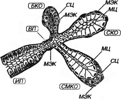 Рис. 5-13 Концевые отделы и выводные протоки слюнных желез. БКО - белковый концевой отдел: СЦ - сероциты, МЭК - миоэпителиальные клетки, СКО - слизистый концевой отдел, МЦ – мукоциты. СМКО - смешанный концевой отдел: сероциты образуют белковое полулуние, ВП - вставочный проток, ИП - исчерченный проток.