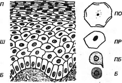 Рис. 9-6. Влагалище. Слева - эпителий на гистологическом препарате, справа - клетки на мазке. Срез: Б - базальный слой, Ш - шиповатый слой, П - поверхностный слой. Мазок: Б - базальные клетки, ПБ - парабазальные клетки, ПР - промежуточные клетки, ПО - поверхностные клетки.