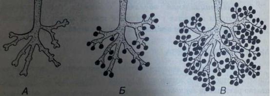 Рис. 9-7. Изменения молочной железы в репродуктивный период. А - у небеременной женщины железа находится в состоянии покоя и состоит из системы выводных протоков, на концах которых имеются терминальные почки; Б - при беременности на концах протоков происходит образование альвеол, которые подготавливаются к секреции молока; В - при лактации альвеолы полностью дифференцированы и активно участвуют в выделении молока. По завершении лактации железа возвращается в исходное состояние.