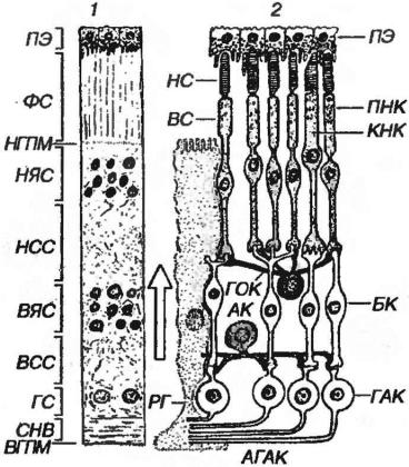-слой нервных волокон, ВГПМ - внутренняя глиальная пограничная мембрана, ПНК - палочковая нейросенсорная клетка, КНК - колбочковая нейросенсорная клетка, НС - наружный сегмент (периферического отростка), ВС - внутренний сегмент, БК - биполярная клетка, ГАК - ганглионарная клетка, АГАК - аксоны ганглионарных клеток, ГОК - горизонтальная клетка, АК - амакринная клетка, РГ - радиальный глиоцит (клетка Мюллера).