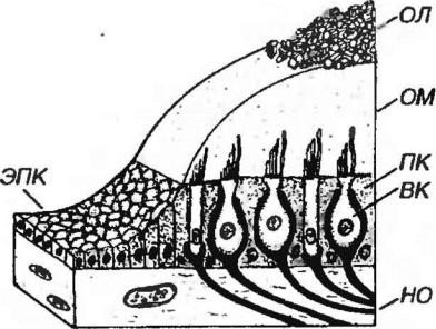 Рис. 10-3. Орган равновесия: пятно. ВК - полосковые клетки, НО - нервные окончания, ПК - поддерживающие клетки, ЭПК - эпителий перепончатого канала, ОМ - отолитоаая мембрана, ОЛ – отолиты.