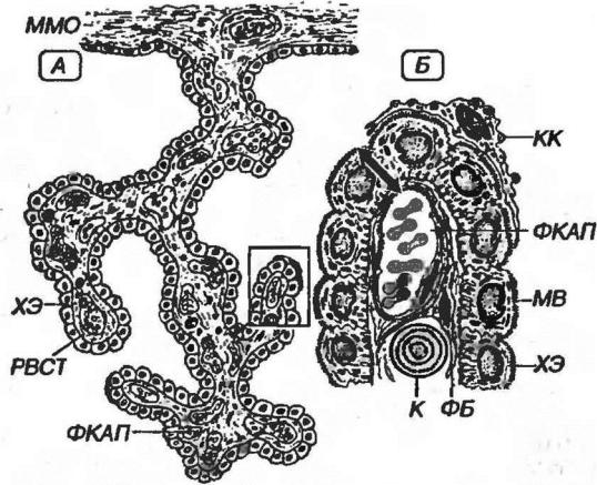 Рис. 11-13. Сосудистое сплетение желудочка головного мозга. А - общий вид участка сосудистого сплетения. ММО - мягкая мозговая оболочка, ХЭ - хориоидные эпендимоциты, РВСТ - рыхлая волокнистая соединительная ткань, ФКАП - фенестрированный капилляр. Е - фрагмент, выделенный рамкой на рисунка А: МВ - микро-ворсинки,ФБ - фибробласт, К - конкреция, КК - клетка Кольмера. Стрелкой показан гемато-ликворный барьер.