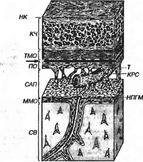 Рис 11-14. Мозговые оболочки. НК - надкостница кости черепа (КЧ), ТМО – твердая мозговая оболочка, ПО - паутинная оболочка, САП - субарахноидальное пространство, ММО - мягкая мозговая оболочка, СВ - серое вещество, Т - трабекула (паутинной оболочки), КРС - кровеносный сосуд, НПГМ - наружная пограничная глиальная мембрана. Субдуральное пространство показано стрелкой.