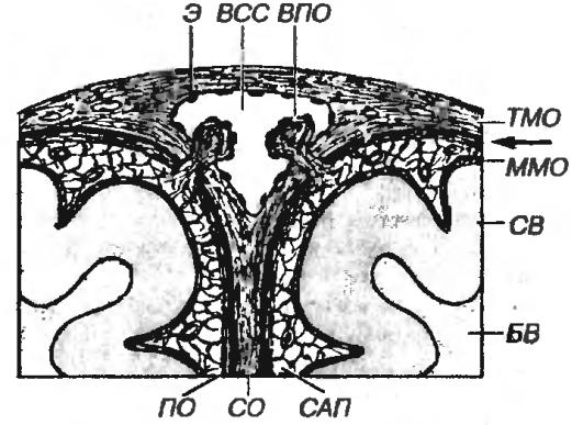 Рис. 11-15. Мозговые оболочки, верхний сагиттальный синус и ворсинки паутинной оболочки. ТМО - твердая мозговая оболочка, ММО - мягкая мозговая оболочка, СВ - серое вещество, БВ - белое вещество, ПО - паутинная оболочка, СО - серповидный отросток, САП - субарахноидальное пространство, Э - эндотелий, ВСС - верхний сагиттальный синус, ВПО - ворсинка паутинной оболочки. Субдуральное пространство показано стрелкой.