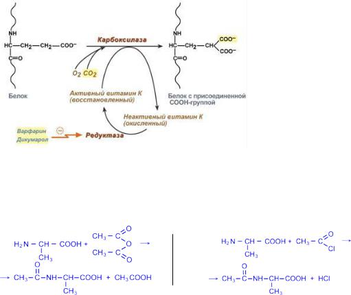 γ-карбоксилирование (модификация глутаминовой кислоты (введение в нее карбоксильной группы, на конце CH(COO-)2