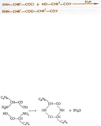 Сначала создаются сложноэфирные связи, а затем полученные блоки соединяются путем образования амидной связи.