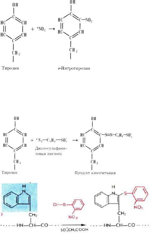 4) Азосочетание. Реакция остатков тирозина с ароматическими солями диазония, также, являющимися катионными реагентами, опять-таки приводит к образованию моно- и ди-о-замещенных продуктов с достаточно протяженной системой сопряженных двойных связей, сто придает им красно-оранжевое окрашивание в реакции Паули (р-р белка смешивают со свежеприготовл. р-ром n-диазобензолсульфокислотой в присут. Na2CO3.) Эта реакция приводит к усилению кислотных свойств гидроксильной группы тирозина.