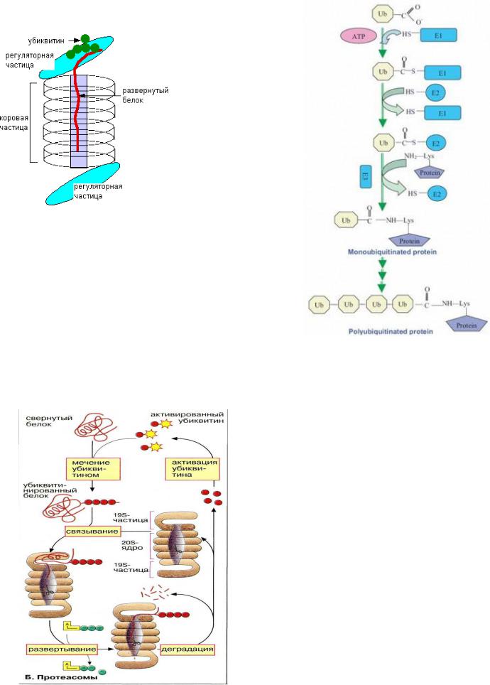 транспортноми ферменту Е2, который при помощи Е3 лигазы присоединяет его к субстрату. Было обнаружено несколько генов кодирующих Е1, десятки генов Е2 и сотни Е3. Используя разные комбинации ферментов клетка регулирует какой белок должен быть разрушен и скорость распада. Развернутый белок перемещается в пространство коровой частицы, где специфически разрезается на короткие пептиды ~8 аминокислот, которые впоследствии могут быть разрушены пептидазами цитозоля.