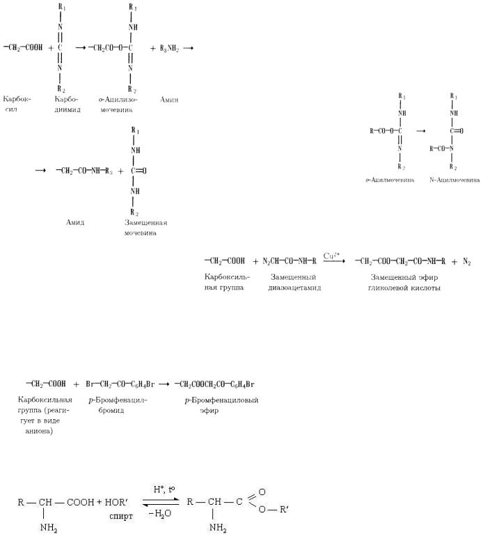 3)Алкилирование карбоксильных групп. В качестве агентов, алкилирующих некоторые карбоксильные группы в белках, могут использоваться α-галоидкетоны, например р- бромфенацилбромид (Br-CH2CO-C6H4Br и его аналоги, а также галоидкислоты):
