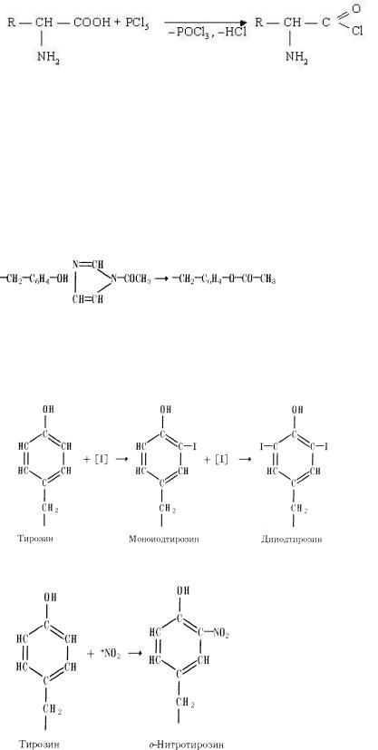6)Иодирование. Эту реакцию часто применяют как способ внедрения реактивных изотопов иода в белковую молекулу. Источником атомов иода может служить комплекс иода и йодистого калия; в некоторых случаях используют иод, образующийся при окислении иодид-иона в присутствии фермента пероксидазы. Иодирование приводит к образованию как моно-, так и дийодтирозина, причем замещение идет в о-положение: