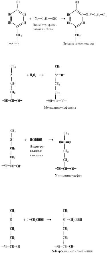 2) Для модифицирования остатков метионина чаще, однако применяют алкилирующие агенты или галоидзамещенные кислоты, в частности иодуксусную кислоту или ее амд. При этом характерно, что сера метионина реагирует с такого рода соединениями даже в слабокислой среде, когда большинство других нуклеофильных групп белка, в частности имидазольные группы гистидина, в реакцию не вступают, будучи протонированы: