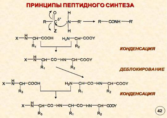 3. Пептидный синтез — это построение пептидной цепи путем соединения аминокислот с помощью химических методов. Обычно речь идет о получении пептидов, содержащих до 40 — 45 аминокислот, таким способом можно осуществить синтез и небольших белков.