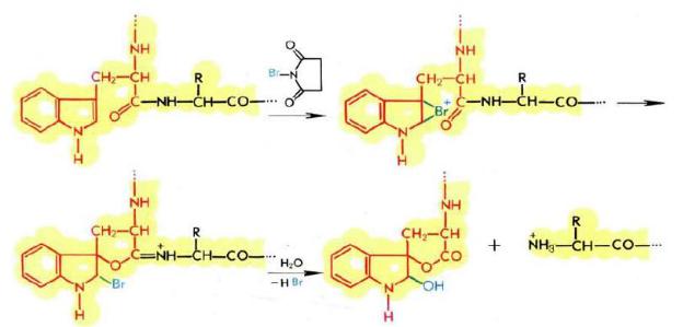 Большое число методов предложено для расщепления белка по карбонильной группе остатка триптофана. Одним из используемых для этой цели реагентов является N-бромсукцинимид: