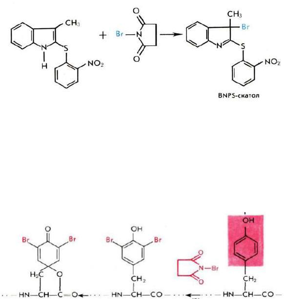 Под влиянием электрофильного агента карбонильная группа остатка триптофана способна вступать в 1,5-взаимодействие с двойной связью индольного кольца, при этом происходит окисление индола до гидроксииндолина, сопровождающееся разрывом пептидной цепи. Реакция проводится при 2 — 3-кратном избытке реагента (рН 4,0; 20С; 2 ч). Расщепление триптофансодержащих пептидов N-бромсукцинимидом происходит с выходом 50 — 90%, а белков — лишь 10—60%. N- Бромсукцинимид способен расщеплять также связи, образованные карбонильными группами