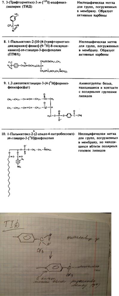 В табл. 1 перечислен также ряд неполярных фотоактивируемых реагентов, которые используются для избирательной модификации аминокислотных остатков белка, контактирующих с гидрофобной областью бислоя. Эти реагенты обычно добавляют к мембранному препарату, дают им возможность накопиться в бислое и затем подвергают их фотоактивации. Преимущество образующихся при этом нитренов и карбенов состоит в том, что их реакции намного менее специфичны по сравнению с реакциями других активных частиц, так что ковалентная модификация не ограничивается боковыми цепями каких-либо определенных аминокислот. Правда, нитрены проявляют избирательность по отношению к нуклеофилам. Использование карбенов предпочтительнее, поскольку они вступают в реакцию с более высоким выходом. Для получения информации о вторичной структуре трансмембранных участков полипептидной цепи путем определения тех остатков, которые контактируют с липидами, использовали реагент ТИД. Например, спираль С бактериородопсина включает метку лишь с одной стороны; это согласуется с