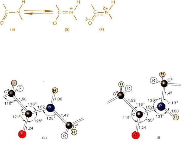 В белках и пептидах связь С—N является частично кратной (в) из-за взаимодействия неподеленной пары электронов атома азота с π-электронной системой карбонильной группы.Обычно пептидная связь имеет транс-конфигурацию. В напряженных циклических системах (некоторые циклопептиды, производные пролина и т. п.), а также при большом размере заместителей у атома азота в N-алкилированных производных пептидная связь может существовать в плоской цис-форме. Цис- и транс-пептидные связи можно различить с помощью физических методов (ИК-, ЯМРспектроскопии и др.). В белках пептидная связь практически всегда имеет транс-конфигурацию.