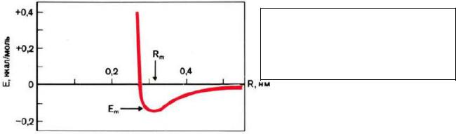 Ван-дер-ваальсовы взаимодействия, описываемые потенциалом Ленард-Джонса (рис. 37), складываются из дисперсионных сил притяжения атомов и сил взаимного отталкивания их электронных оболочек. Как видно из рисунка 37, наиболее выгодным является расстояние Rm, равное или близкое сумме эффективных радиусов взаимодействующих атомов. Энергетический вклад каждого контакта невелик, но ввиду их большого числа ван-дер-ваальсовы взаимодействия дают основной вклад в суммарную энергию внутримолекулярных невалентных взаимодействий.