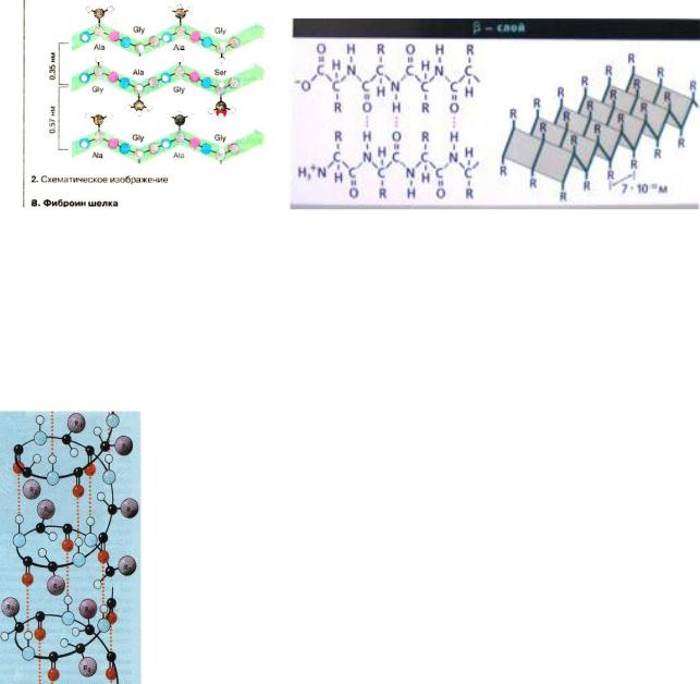 В фиброине шелка полипептидные цепи расположены антипараллельно, а в β-кератине стягиваются дополнительно липопротеином серицином.
