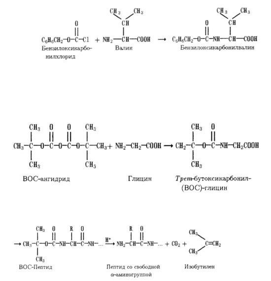 Одной из первых была предложена (сохранившая значение до сих пор) бензилоксикарбонильная группа (Z, устар. карбобензоксигруппа). Вводят, ацилируя пептид бензилоксикарбонилхлоридом