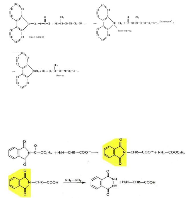 Среди уретановых группировок несомненный интерес представляют устойчивые к ацидолизу, но удаляемые мягким щелочным гидролизом 9-флуоренилметилоксикарбонильная (Fmoc) и метилсульфонилэтилоксикарбонильная (Msc). Fmoc-группа широко применяется, в частности, в твердофазном синтезе пептидов.