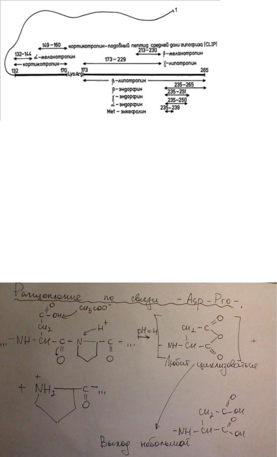 Прежде всего, говоря о расщеплении белка-предшественника на отдельные пептиды, стоит упомянуть великий и могучий проопиомеланокортин, или сокращённо ПОМК — прогормон, сложный полипептид, синтезируемый кортикотропными клетками передней доли гипофиза и меланотропными клетками средней доли гипофиза и состоящий из 241 аминокислоты.