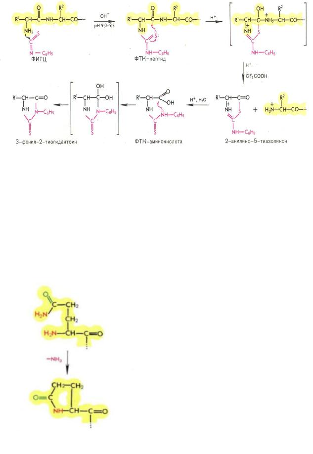 1)ФИТЦ (фенилизотиоцианат, мощный электрофильный агент) реагирует с незаряженной N-концевой аминокислотой в слабощелочных условиях, формируя ФТКпроизводное (фенилтиокарбомоил-производное).