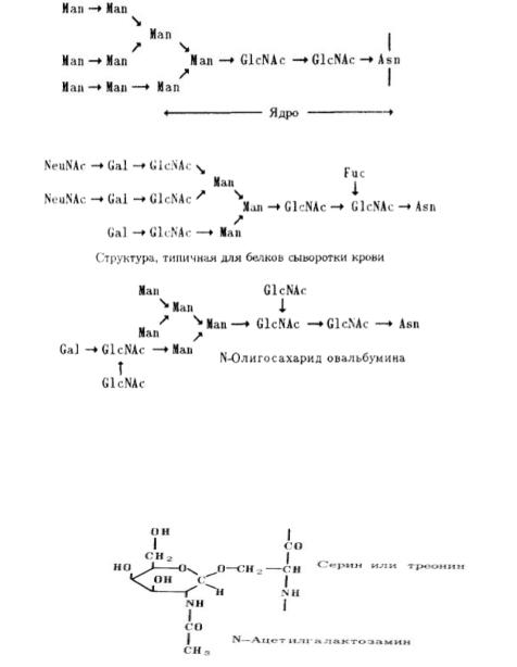 N-гликопротеины: Углеводный остаток присоединяется к амидному азоту остатка аспарагина (желательна непосредственная близость гидроксиаминокислот). Первым моносахаридом обычно оказывается N-ацетилглюкозамин, так что «узел» присоединения имеет следующую структуру: